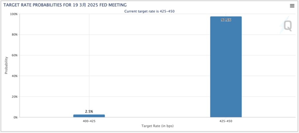 根据芝商所的美联储观察工具显示,美联储3月维持利率不变的概率为97.5%,降息25个基点的概率仅为2.5%。