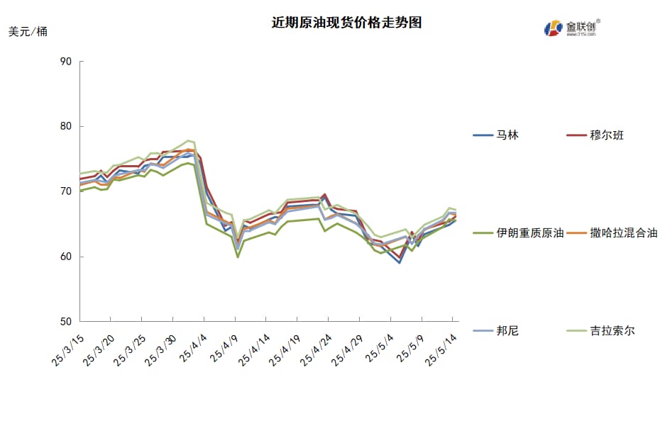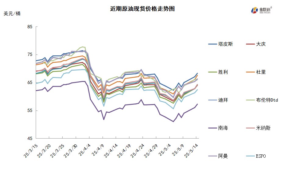 本周(5.8-5.14),原油整体呈现震荡上行的走势,周均价环比上涨。