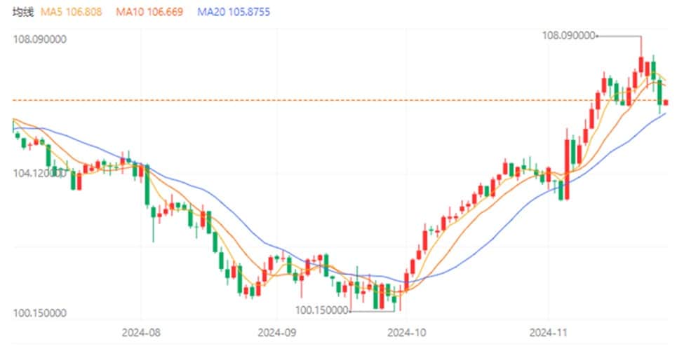 特朗普的政治口号以“美国优先”为核心,“让美国再次伟大”,目标是加强美国经济实力,提升就业率,减少对外依赖。美元指数也从其当选后不断创下新高,11月22日,美元指数最高达到了108.12,创下了两年多来的新高,自10月初的100点左右计算,两个月不到的时间,美元指数涨幅接近8%。