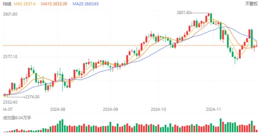 黄金作为大宗商品中具备良好避险价值的标的一直受到投资者的关注,美国财政赤字上升、再次降息25个基点的预期、全球地缘政治紧张局势加剧以及美国大选的不确定性导致金价上涨至2800美元/盎司以上的历史高位。但到了大选当天国际黄金价格开始回落,直到11月中下旬才开始出现回升。虽然黄金短期承压,但由于地缘冲突频发,以及具有抗通胀的特性,市场仍然看多黄金的中长期走势。