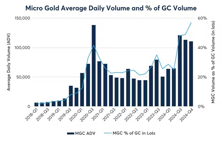 在投资配置上,芝商所旗下的微型黄金期货合约是专门为投资较小黄金增量的交易者所设计的。它们同时也诞生于世界上最大型且流动性高的基准黄金期货(GC)承诺的高成本实现替代选项。微型黄金期货和期权的规模为基准黄金期货和期权合约的1/10,不仅具备同等优异的交易透明度、价格发现,还能获得较低的保证金要求。