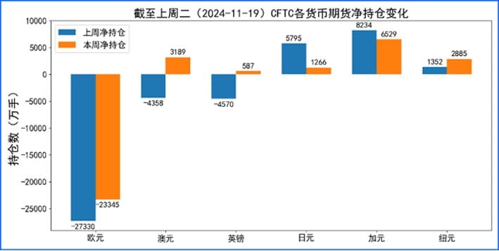 据美国商品期货委员会公布的2024-11-19期货市场头寸持仓报告显示,上周各货币的报告总持仓情况如下:欧元净多头变化3985手,澳元净多头变化7547手,英镑净多头变化5157手,日元净空头变化4529手,加元净空头变化1705手,纽元净多头变化1533手,上周总持仓多空转换的货币有:澳元,英镑。除此之外,单向总持仓变动超过20%的货币有:纽元。