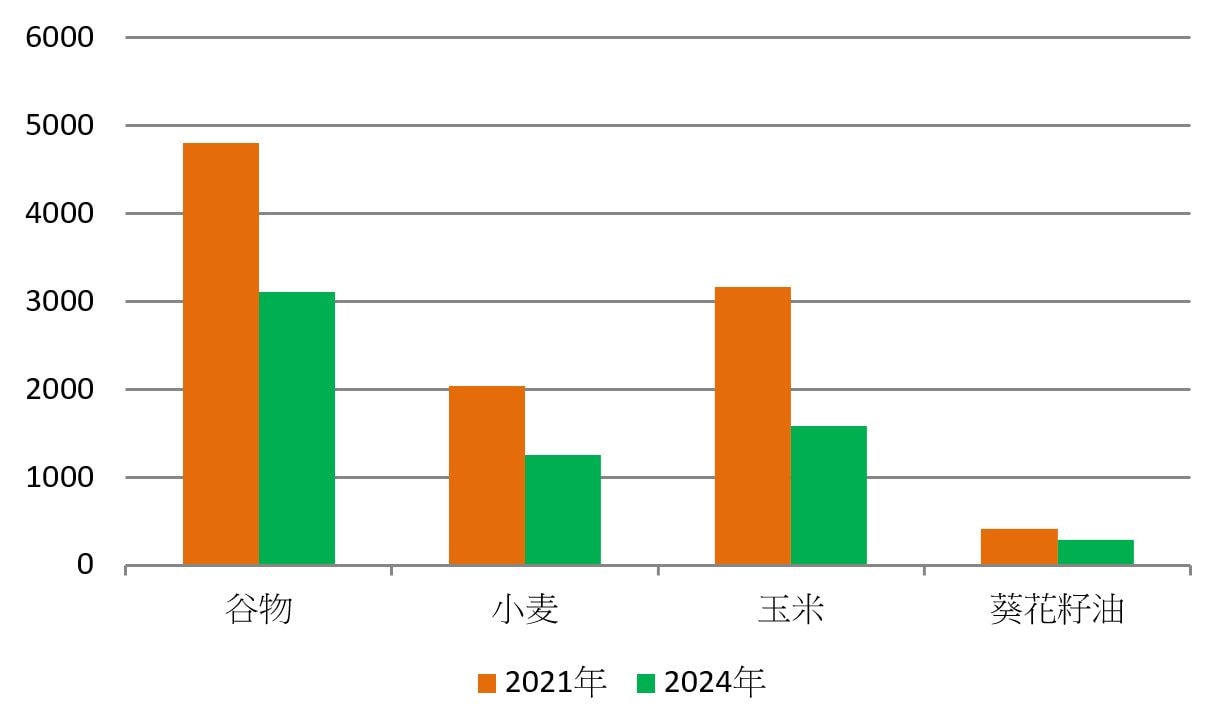 图为2024年和2021年乌克兰谷物和葵花籽油出口对比(单位:万吨)