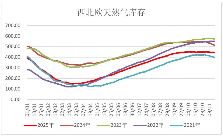 美国的情况与欧洲类似。在经历了冬季的大幅提取后,夏季注气速度高于平均水平,使得库存水平持续回升,市场对冬季供应的担忧有所缓解。截至10月31日当周,美股储气量周环比增加330亿立方英尺至39150亿立方英尺,同比较去年同期略微低0.4%。