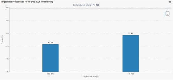 这种分歧直接导致市场对12月降息预期的剧烈波动。CME FedWatch工具显示,市场预期美联储在12月减息的机率已降至42.9%,为9月以来首度跌破50%,预期按兵不动的机率则升至57.1%。