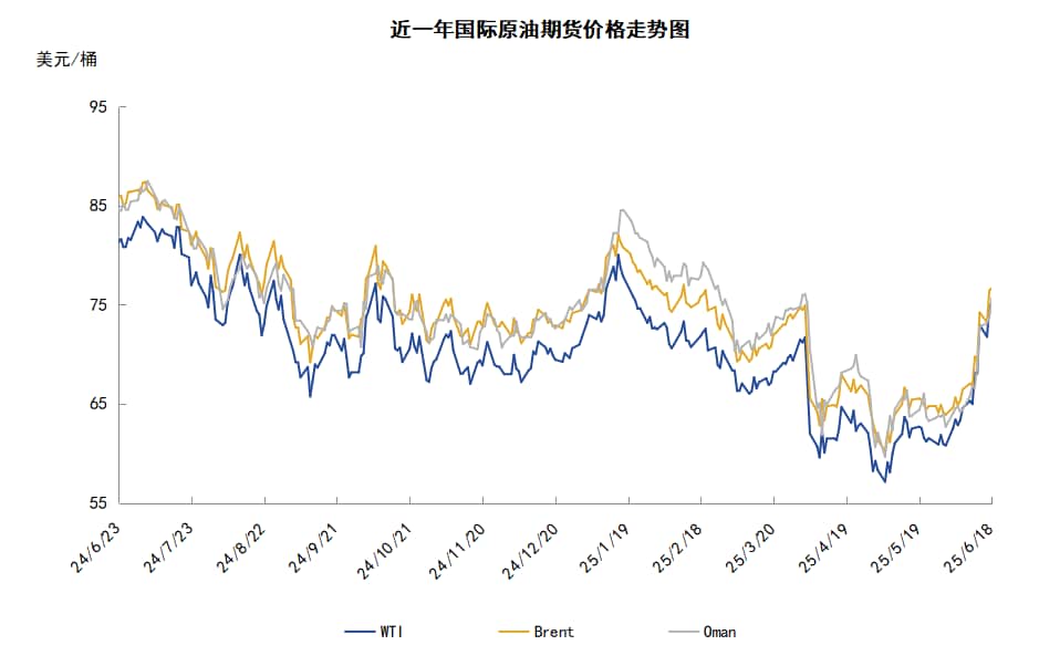 导读:本周(6.12-6.18),国际原油价格整体呈现震荡上行的走势。WTI均价72.55美元/桶,较前一周上涨7.28美元/桶,或11.16%。周内,对油价起到支撑的因素有:伊朗与以色列爆发冲突,中东地缘局势骤然紧张,中美贸易协商趋势向好以及美国原油库存减少。