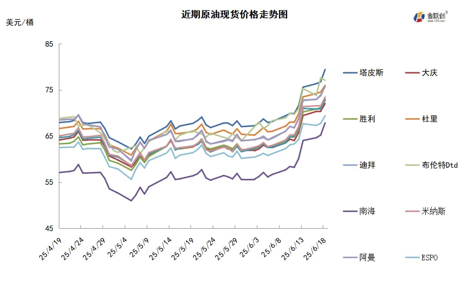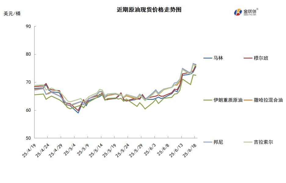 本周,国际原油现货均价环比上涨。中东原油市场方面,中东地区的持续冲突已经提升了原油供应可能中断的担忧,不过,目前石油生产和出口设施似乎没有受到影响。与此同时,中东至亚洲航线超级油轮的运费自冲突爆发以来已经攀升,亚洲的部分终端用户继续在现货市场购买中东原油。贸易消息人士表示,卡塔尔能源公司将6月装埃尔沙欣原油船货的合约价格上调至迪拜价格升水2.48美元/桶,为一年以来的最高升水。卡塔尔能源部公司将所有5船6月装埃尔沙欣原油船货出售给道达尔能源。因为沙特阿美公司将提供给合约买家的7月装阿拉伯重质原油和阿拉伯中质原油削减,道达尔能源公司一直在采购埃尔沙欣原油。亚太原油市场,因供应和需求基本面吃紧,8月装拉布安原油的现货价差攀升。8月装拉布安原油的交易价在每桶对即期布伦特升水7美元高段位。此外,因中东冲突升级,全球运费在攀升。因为马来西亚原油的运输距离比中东原油或套利原油更短,马来西亚原油的现货需求强劲,PTT Public通过标书购买了8月装拉布安原油船货,其购买价为每桶对即期布伦特升水8美元低段位。文莱能源服务公司(BEST)通过标书销售了一船8月装Kimanis原油,买家为澳大利亚的Ampol,售价为每桶对官方售价升水高于1美元。另外,8月装越南翠鸟原油的现货价差攀升,因需求强劲。8月装翠鸟原油的交易价为每桶对即期布伦特升水6美元中段位。几位终端用户希望购买越南原油,因为感觉前往亚洲的美国和非洲等套利原油价格更高。