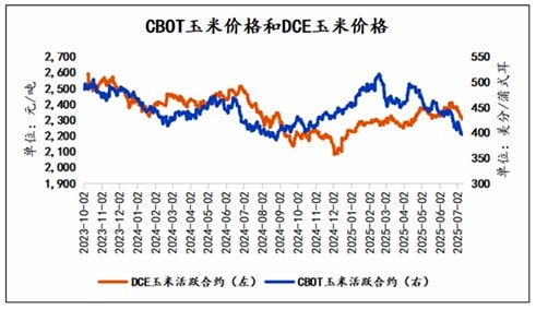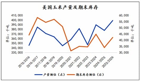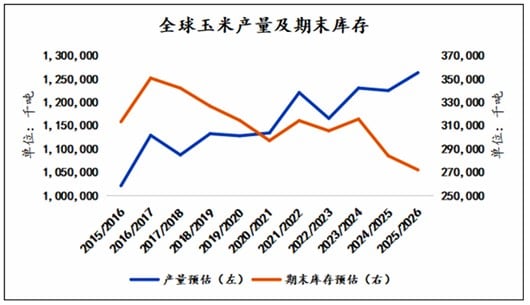 美国农业部(USDA)5月份开始公布全球新季玉米供需预估。截至7月份,依然维持2025/2026年度全球玉米产量同比小幅增长,以及全球玉米期末库存小幅下降的预估。