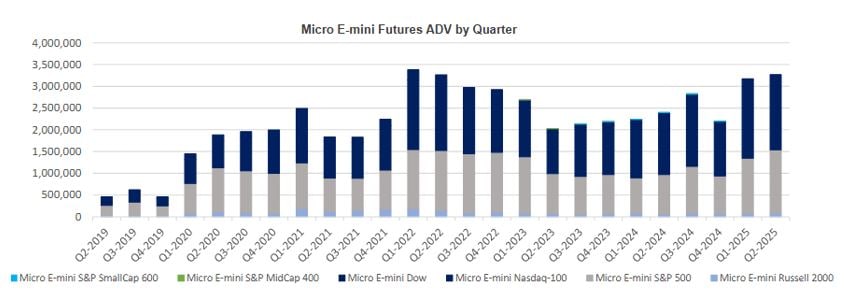 成交活跃:2025年第二季度,日均交易量超过340万份合约(较2024年第二季度增长43%),所有合约的持仓总量为41万份。微型E-迷你纳斯达克 100 期货(MNQ)的日均成交量创下 180 万份合约的纪录,占微型E-迷你期货产品总日均成交量的 53%。其中,MNQ 在 4 月 7 日创下单日成交量 350 万份合约的纪录。4 月是微型E-迷你期货产品创纪录的一个月,日均成交量达到 460 万份合约。