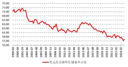 黄金则受益于美国加征关税影响而不断创历史新高。贸易保护主义冲击全球贸易体系,美联储独立性受到冲击,地缘政治联盟出现松动,一系列挑战正改写全球秩序,美元信用受到特朗普加征关税的冲击进一步削弱,全球其他国家寻求替代美元的结算货币,以降低对美元的依赖。从国际外汇储备币种占比上看,本世纪初美元份额达71%以上,2024年四季度已经降至57.8%,显示全球央行对美元信任度降低。近期美遭遇大规模抛售也是美元信用走弱的一个佐证。