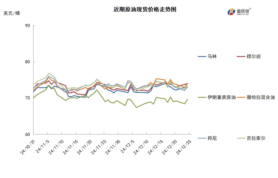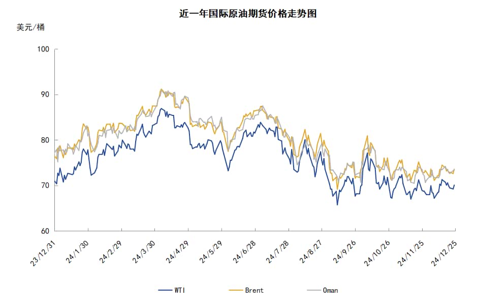 但另一方面,美国原油与成品油库存减少的预期对油价起到支撑作用。市场机构预期,截至12月20日当周,美国原油库存预计减少约190万桶,美国汽油库存预计减少约110万桶,包括柴油和取暖油的馏分油库存预计减少约30万桶。美国石油学会(API)数据也显示,截至2024年12月20日当周,美国商业原油库存减少320万桶。此外,印度公布的官方数据显示,该国11月原油进口量较去年同期增加2.6%至1907万吨,市场对印度能源需求前景预期乐观也支撑油价。