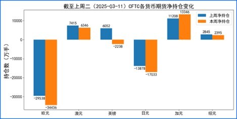 据美国商品期货委员会公布的2025-03-11期货市场头寸持仓报告显示,上周各货币的报告总持仓情况如下:欧元净空头变化4898手,澳元净空头变化1069手,英镑净空头变化8290手,日元净空头变化3155手,加元净多头变化2138手,纽元净空头变化450手,上周总持仓多空转换的货币有:英镑。除此之外,单向总持仓变动超过20%的货币有:日元。