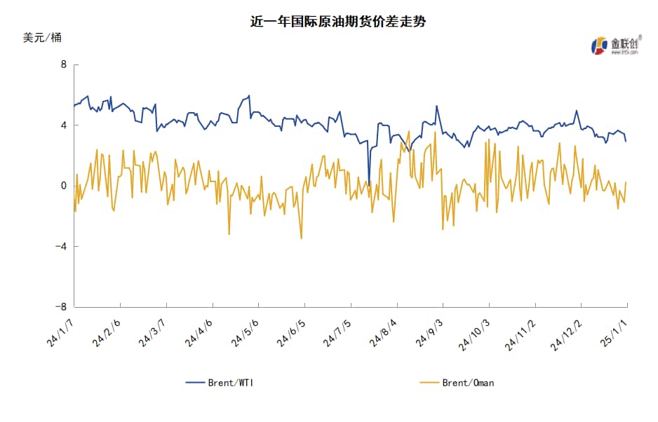 因1月1日为元旦假期,EIA推迟公布美国石油库存数据。美国能源信息署数据显示,截至2024年12月20日当周,原油库存比去年同期低4.53%;比过去五年同期低5%;汽油库存比去年同期低1.06%;比过去五年同期低3%;馏分油库存比去年同期高0.6%,比过去五年同期低10%。此外,上周美国原油进口量平均每天647.1万桶,比前一周减少17.8万桶,成品油日均进口量153.2桶,比前一周减少46.9万桶。