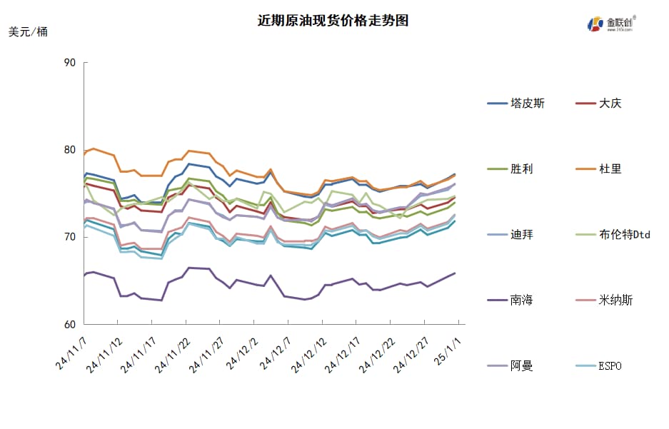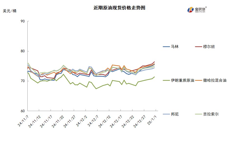 本周,国际原油现货均价环比上涨。中东原油市场方面,还有部分2月装穆尔班、上扎库姆和阿曼原油现货可供销售,3月装中东原油现货的磋商还没有全面开启,不过,INPEX已经售出穆尔班和上扎库姆原油。贸易商仍认为买家对中东原油的需求仍坚挺。北亚买家对阿曼和穆尔班原油还有购买兴趣,不过,尚未证实是否有新的交易达成。由于年底各种假期以及3月船货交易尚未正式开始,所以中东原油市场的现货交投仍冷清。亚太原油市场,印度巴拉特石油公司正购买中东原油以弥补俄罗斯减少的石油供应。印度国营炼油商通常在现货市场购买俄罗斯原油而非长约下购买俄罗斯原油,因此,印度炼油商在现货市场购买到的原油数量不稳定,这些炼油商无法购买大约800-1000万桶1月装俄罗斯原油。越南PV OIL公司通过标书销售了SV-DN原油,决标价格尚不明朗。另外,越南PV OIL公司通过标书销售了30万桶2月7-14日装Ruby原油,决标价格为每桶对即期布伦特升水4美元左右。一位新加坡的交易商指出,此次决标价高于1月装船货的决标价格,因为受中质馏份油裂解价差坚挺影响,几位终端用户购货意愿强。