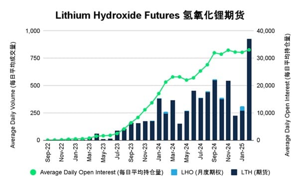 图2:氢氧化锂期货月度每日平均交易量和持仓量(截至2025年2月18日)