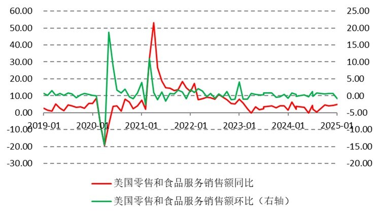 图为美国零售和食品服务销售额同比和环比增速