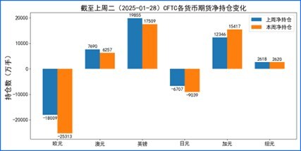 据美国商品期货委员会公布的2025-01-28期货市场头寸持仓报告显示,上周各货币的报告总持仓情况如下:欧元净空头变化7304手,澳元净空头变化1433手,英镑净空头变化2346手,日元净空头变化2332手,加元净多头变化3071手,纽元净多头变化2手,上周没有总持仓多空转换的货币。除此之外,单向总持仓变动超过20%的货币有:欧元,日元,加元。