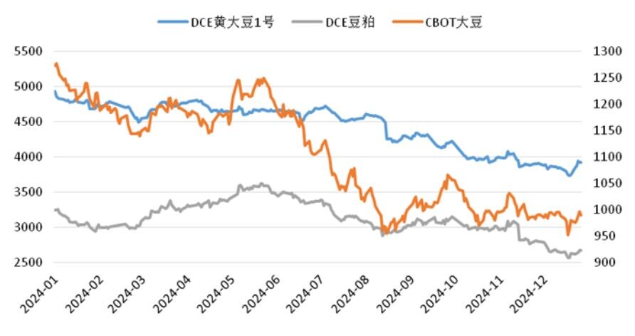 2024年12月19日,CBOT大豆主力下探至最低的947美分/蒲式耳,随后因为巴西大豆贴水企稳以及南美未来偏干的天气而开启反弹,国内豆粕也因此而止跌上涨,市场在等待USDA1月报告指引。由于国内外豆类的联动性,国内黄大豆1号主力跌至最低的3711元/吨之后再度走强。另外,国产大豆收储消息以及压榨补贴传闻也提振盘面。