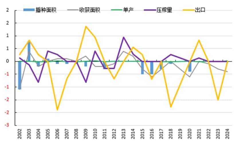 从2001年到2024年的24次USDA1月报告中,美国大豆单产只有3次没有调整,播种面积8次未变;由于天气等因素,最终收获面积变动更多一些,只有4次未作调整;出口调整8次,压榨调整14次,需求端的调整次数少一些。