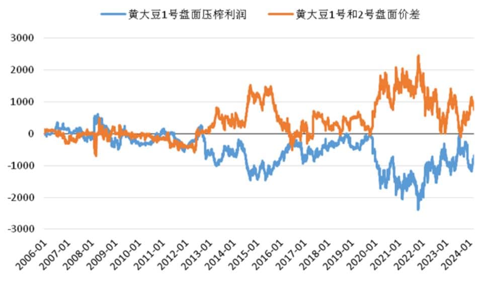 图3:DCE黄大豆1号对盘面压榨利润、DCE黄大豆1号和2号盘面价差(元/吨)