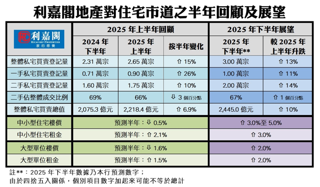 二手市場方面,相信在下半年經濟持續好轉,股市及零售消費市道均向好及仍有減息空間等,也能帶動二手交投造好,料下半年二手私宅登記量將較上半年的約1.75萬宗再升10%,至2萬宗水平;全年累計,二手買賣料錄3.75萬宗水平,將較2024年約3.22萬宗增加16%。綜合預測,在下半年一二手齊步向好推動下,整體私宅登記量料漲13%,最終料達3萬宗水平;而全年總計料錄約5.65萬宗,將較2024年的約4.84萬宗增17%。