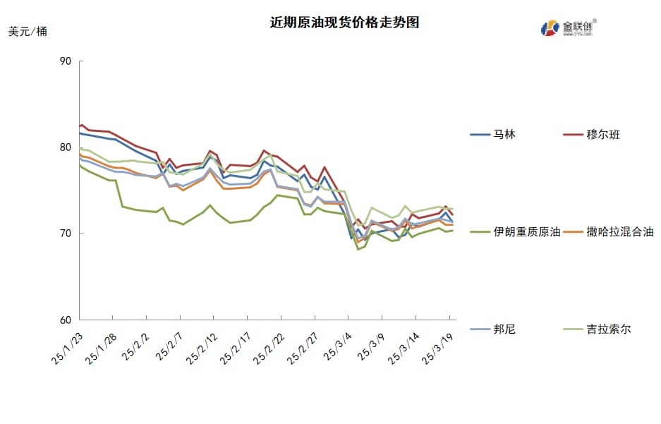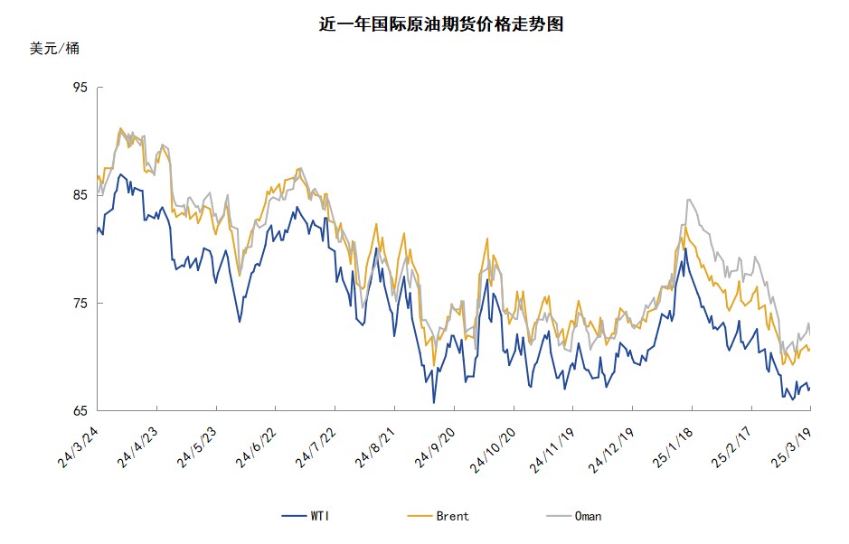 导读:本周(3.13-3.19),原油整体呈现区间震荡的走势。WTI均价67.07美元/桶,较前一周上涨0.40美元/桶,或0.60%。周内,对油价起到支撑的因素有:中东地缘局势升温,俄方表态缓解市场对OPEC+增产的担忧以及美国成品油库存减少。另一方面,导致油价承压的因素有:市场对俄乌局势缓和的预期以及IEA预计市场供应过剩。
