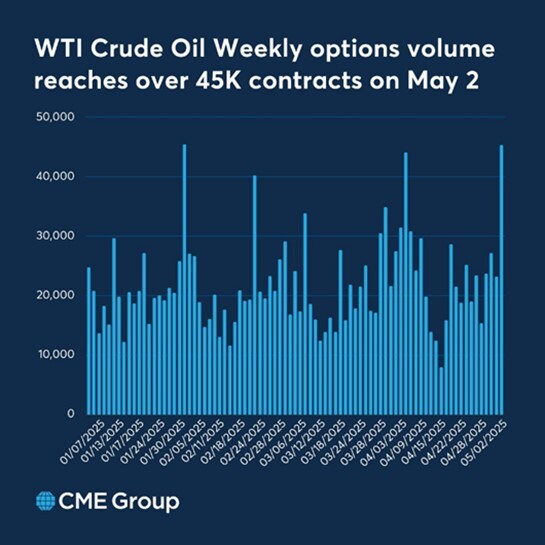 综上所述,全球原油需求过剩的供需基本面意味着2025年原油价格易跌难涨,尤其是OPEC+复产和非OPEC增产,导致原油产出增长加快。而需求端缺乏增长点,不论是能源转型还是全球经济增速放缓都意味着原油需求很难有超预期表现。中美关税谈判取得进展,可能只是缓和了全球经济下降的幅度和斜率,带来原油短期反弹,但很难逆转过剩格局。投资者可以考虑运用芝商所旗下以美元计价的 WTI原油每周期权合约和上期能源的原油期货、期权对冲原油价格冲高回落风险。在全球贸易不确定性中,交易员们纷纷使用 WTI 原油周度期权来管理因 OPEC 增产决定而导致的价格波动。数据显示,5 月 2 日,WTI 原油周期权交易量突破 4.5 万份合约(看下图)。
