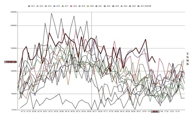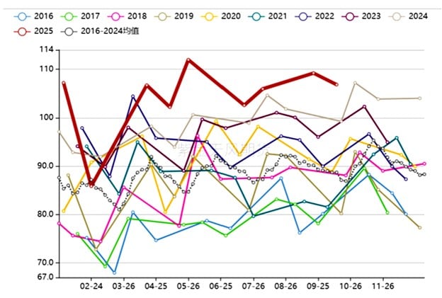 截至10月30日,北方四港玉米库存94.5万吨,比2024年同期减少96.4万吨;全国饲料企业平均库存24.1天,较上周增加0.06天,环比增长0.25%,同比下降13.74%,饲料企业库存偏低。库存处于四年同期最低,只是短期建立库存意愿不强,大多以执行订单为主。