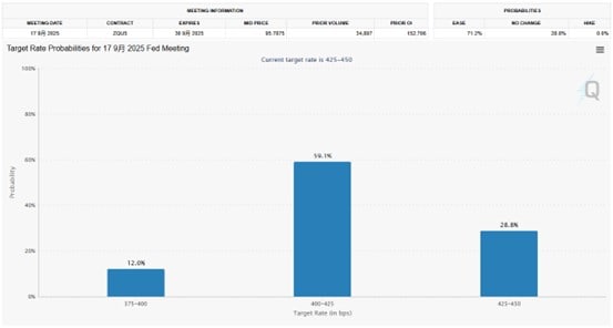 基于当前情况,若6-8月通胀延续放缓趋势,且失业率突破4.3%,美联储可能开启预防式降息。随着关税效应在零售端充分显现(沃尔玛等已开始涨价),核心通胀可能在三季度逼近3%,二次降息将在12月落地以对冲物价冲击。这一路径与当前市场定价的77基点降息幅度基本吻合。